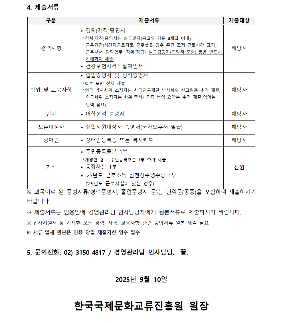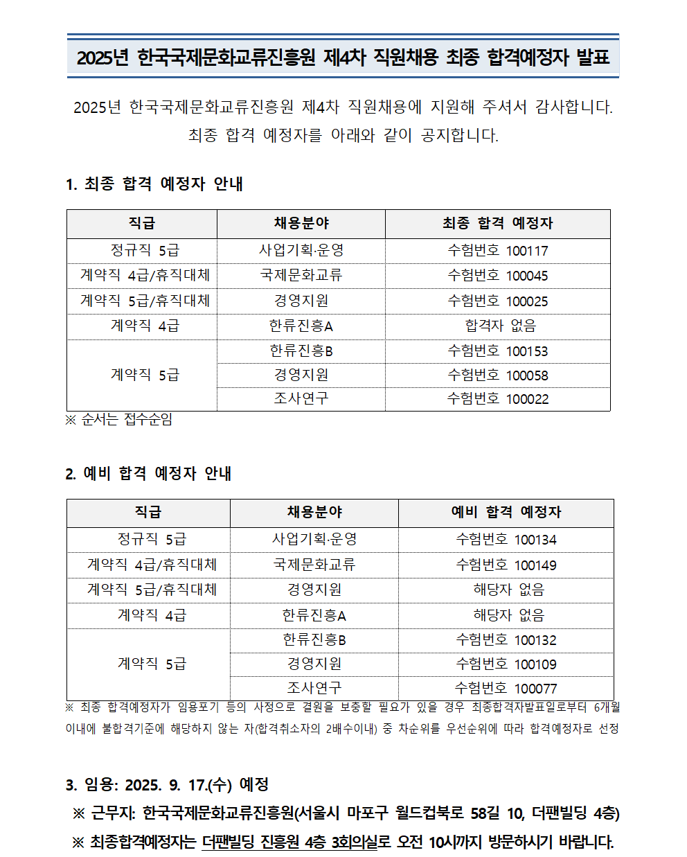 2025년 한국국제문화교류진흥원 제4차 직원채용 최종 합격예정자 발표