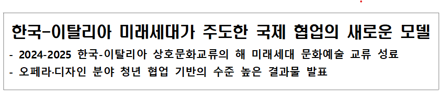 2024-2025 한국-이탈리아 상호문화교류의 해를 기념해 추진된 청년 예술가 교류 프로그램(오페라·디자인)이 한국에서 성공적으로 진행되었다. 이번 교류 사업은 문화체육관광부(장관 최휘영) 주최, 한국국제문화교류진흥원(원장 박창식, 이하 코피스) 주관으로 추진되었으며 오페라 프로그램은 서울대학교 음악대학과 라 스칼라 극장 아카데미가, 디자인 프로그램은 양국의 디자인 분야 전문가들이 멘토로 참여하여 완성도 높은 협업 구조를 구축하였다. 이를 통해 양국의 미래세대 예술가들은 기획·연습·제작·발표에 이르는 전 과정을 함께 경험하며 청년 문화교류의 새로운 모델을 제시했다.