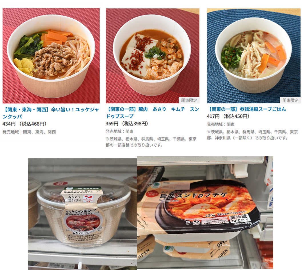 올해 11월의 판매 동향을 살펴보면 '한국의 매운맛'을 키워드로 순두부찌개 등 여전히 매운 음식들이 판매되고 있지만, 이전보다 다양한 형태의 국물 요리가 판매되고 있다. 예를 들면 한국 육개장과 국밥을 결합한 육개장 국밥이 있다. 흰쌀과 보리를 섞은 밥에 소고기 육수, 고추장이 들어간 육개장 국밥으로 468엔에 판매되고 있다. 도쿄를 비롯한 관동지역 한정으로는 해물 김치 순두부찌개(398엔)와 삼계탕 국밥(450엔)이 판매되고 있다. 또한 닭고기가 들어간 한국풍 매운 국물 요리인 닭개장 스프(498엔)도 도쿄 점포 한정으로 판매되고 있다. 한국식 국물 요리가 지역 한정 판매가 아닌, 전국적으로 판매가 확대 되기를 기대해본다.