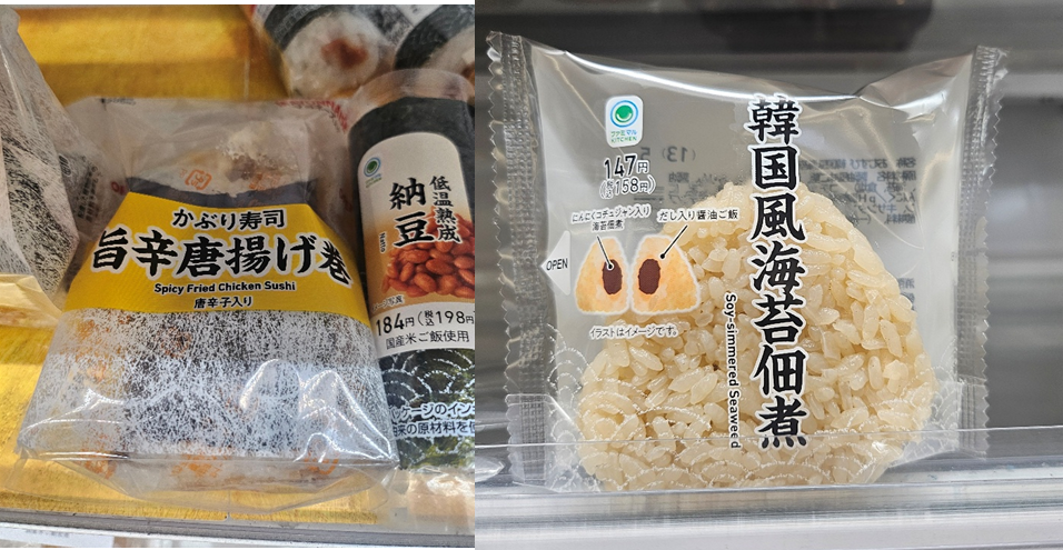 국물 요리 외에도 양국 음식을 조합한 특별한 삼각김밥을 판매 중이다. 김밥 진열대를 살펴보면 맛있게 매운 닭튀김인 가라아게가 들어있는 삼각김밥(184엔)과 짭짤한 간장밥 속에 마늘 고추장이 버무려진 한국 김조림이 들어간 삼각김밥(147엔)이 판매 중이다. 각 삼각 김밥에는 매운맛을 돋우기 위해 고춧가루와 고추장이 첨가되어 한국 맛을 떠올리게 한다.