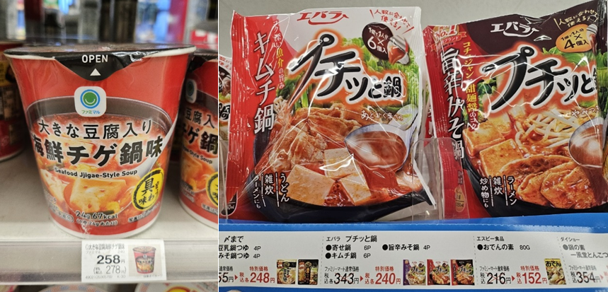 한류 콘텐츠의 영향으로 각양각색의 한국 문화가 주목받는 가운데 이번 현장 리포트에서는 일본 편의점인 패밀리 마트(ファミリーマート)를 중심으로 일본 사회 속 한국 푸드의 동향을 취재해 보고자 한다. 패밀리 마트에서는 계절마다 한류 동향을 반영하여 한국 제품들을 적극적으로 판매하고 있다. 올해 2월에 취재한 패밀리 마트의 한국 음식 동향과 비교 분석하여 9개월이 지난 현시점에 주목받는 한국 식품과 함께 판매 동향의 변화를 종합적으로 알아보고자 한다. 겨울로 접어들면서 국물 요리가 먹고 싶어지는 지금의 계절, 일본 사람들이 제일 좋아하고 먹고 싶은 한국의 국물 요리는 무엇일까? 올해 2월에는 한국의 육개장과 해산물 찌개를 중심으로 겨울나기를 위한 따뜻한 국물 요리가 판매되어 주목을 받았다. 해산물 찌개에는 두부가 가득 들어가 마치 해물 순두부찌개를 연상케 했다. 또한 김치찌개와 매운 된장찌개를 밀키트 형태로 판매하여 가정식으로도 한국 음식을 즐길 수 있도록 구성했다.