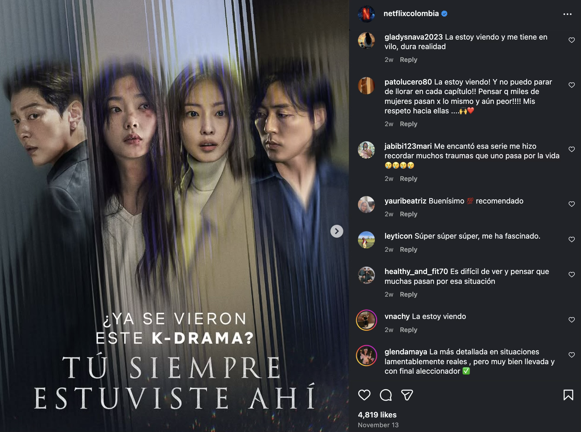< '당신이 죽였다'에 대한 댓글 반응 - 출처 : 넷플릭스 콜롬비아 인스타그램 계정(@netflixcolombia) >