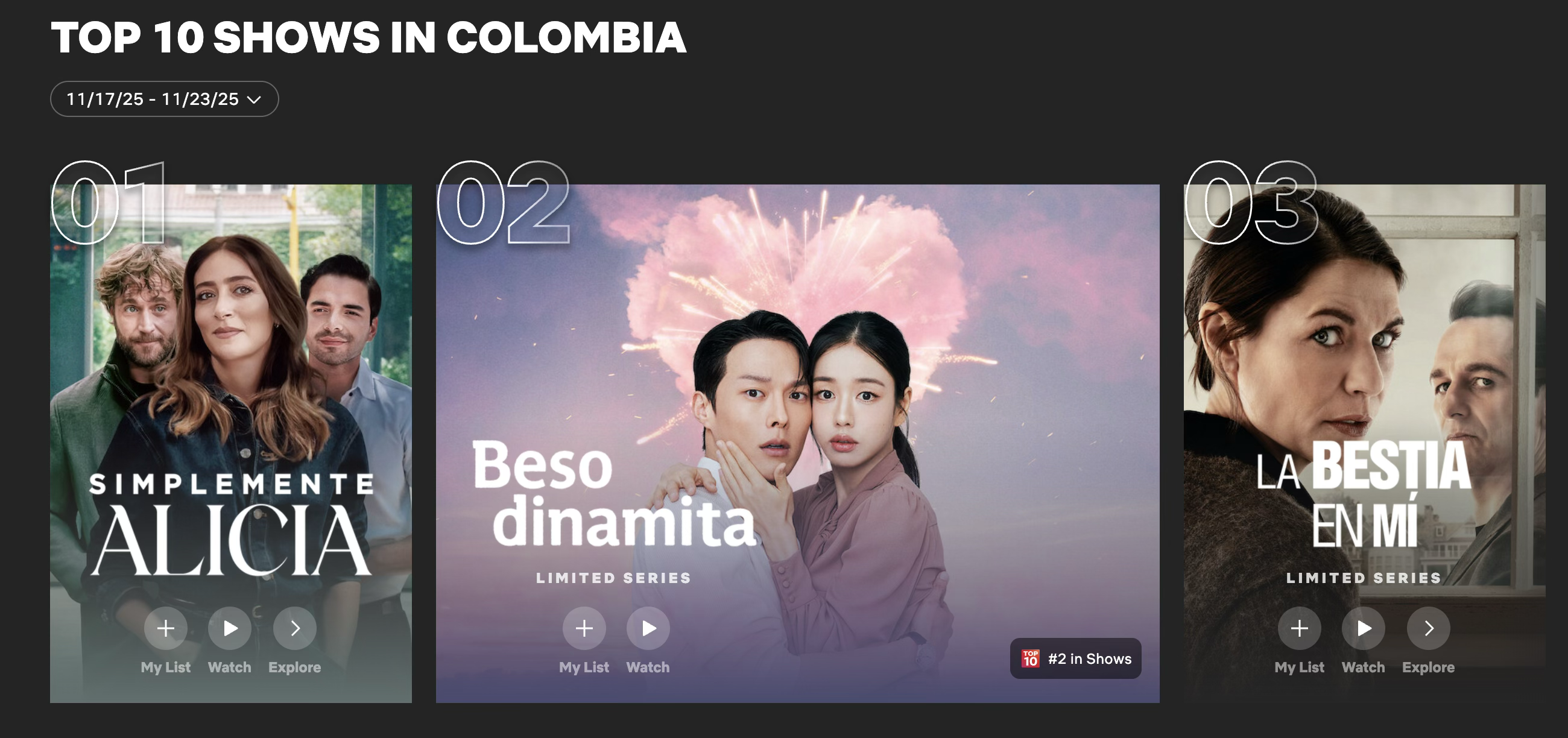 11월 콜롬비아 넷플릭스에서는 한국의 스릴러 드라마 <당신이 죽였다>와 로맨틱 코미디 <키스는 괜히 해서!>가 높은 인기를 얻었다.