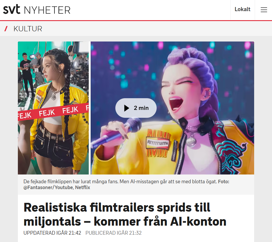 이 같은 세계적인 열풍에 스웨덴 공영방송 ≪스웨덴 텔레비전(SVT)≫ 역시 주목하며 이와 관련된 보도를 뉴스 메인 페이지에 게재했다. 단순한 인기 작품 이상의 사회 문화 현상이라는 점에서 ≪SVT≫는 최근 온라인에서 급속도로 확산되는 <케이팝 데몬 헌터스>의 실사판·후속편 영화 유출 영상 논란을 집중 분석했다. ≪SVT≫는 틱톡(TikTok)과 유튜브에 퍼진 수백만 조회수를 기록한 관련 영상 10편을 직접 검증한 결과, 모든 장면이 <케이팝 데몬 헌터스>에서 나온 영상이 아니며 모두 인공지능 기반의 팬 제작물이라고 보도했다. 특히 ≪SVT≫는 이 영상들이 기존의 팬메이드 트레일러와는 다른 점을 주목했다. 팬들이 출처를 직접 밝히며 공유하던 기존의 제작물들과는 달리, 최근 영상들은 일부 계정이 '실사판 제작 장면 유출', '2편 첫 번째 트레일러' 같은 제목으로 대중의 오해를 유도해 조회수를 높이는 방식이었기 때문이다. ≪SVT≫는 어린 시청자들까지 해당 팬메이드 트레일러 영상에 속아 문의를 보내는 사례가 늘고 있다고 전했다.