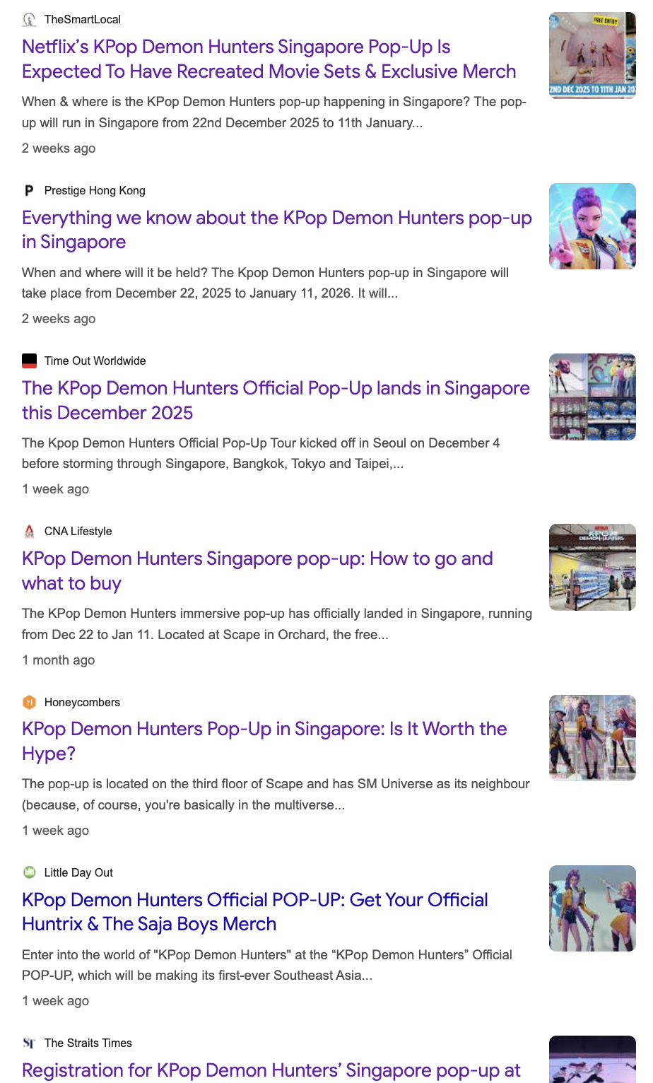 2025년 12월 22일, 넷플릭스(Netflix) 애니메이션 <케이팝 데몬 헌터스(Kpop Demon Hunters)>의 공식 팝업 매장이 싱가포르의 중심지 오차드 로드(Orchard Road)의 복합 문화 공간인 스케이프(SCAPE)에서 오픈하며 현지 언론과 트렌드 정보지 매체들의 뜨거운 관심을 받고 있다. 이번 팝업은 12월 22일에서 1월 11일까지 단기 운영되는 행사임에도 불구하고 종합 일간지부터 방송, 온라인 라이프스타일(lifestyle) 플랫폼까지 다양한 성격의 언론 매체들이 이를 각각 기사로 다루며 관련 소식들을 전하고 있다.