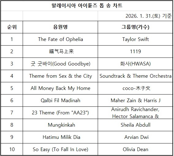 < 2026년 1월 말레이시아 아이튠즈 톱 송 차트 >