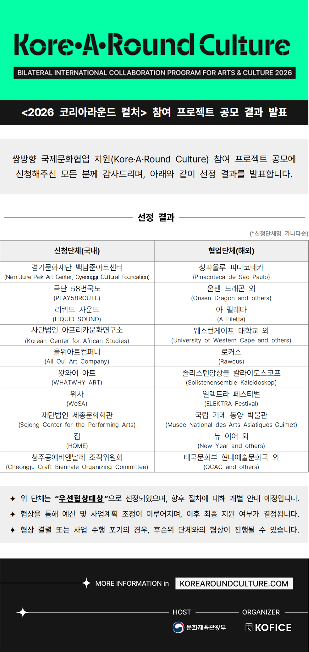 공지사항<2026 코리아라운드 컬처> 참여 프로젝트 공모 결과 발표