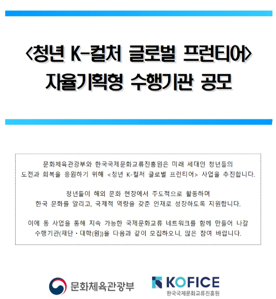 한국 문화예술의 글로벌 위상 강화에 따라 증가하는 해외의 국내 기반 협업 수요에 대응하고, 국내외 문화예술 교류 및 협업 활성화를 지원합니다. 국내 문화예술인의 국제 무대 진출을 위한 선순환 환경을 조성하며, 한국을 거점으로 한 인·아웃바운드 문화예술 행사 개최를 통해 교류의 장을 마련합니다. 이를 통해 협업 국가들과 지속 가능한 쌍방향 문화예술 교류를 확산합니다.