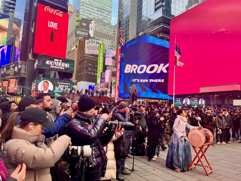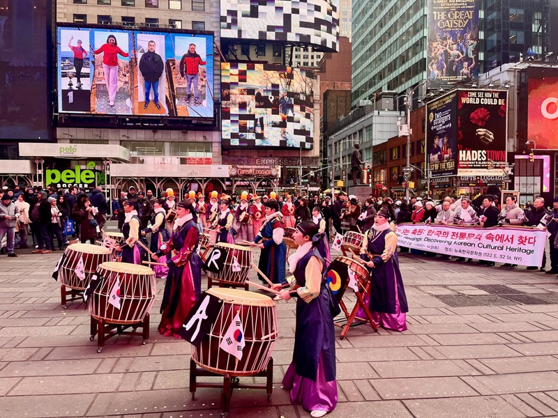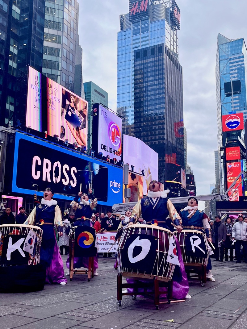 설날을 맞은 뉴욕 한복판에 한국 전통 북소리가 힘차게 울려 퍼졌다. 2월 11일(현지시간) 타임스스퀘어에서 막을 올린 이번 행사는 ‘국가유산 방문 캠페인’의 일환으로 마련된 특별 프로그램으로, 전시(Exhibition)·공연(Performance)·경험(Experience)이라는 세 가지 테마를 통해 한국 유산의 가치를 입체적으로 선보였다. 이번 행사는 국가유산청과 국가유산진흥원이 뉴욕한국문화원과 공동 주최했으며, ‘빛의 축원: 찬란히 빛나는 한국의 유산들(Golden Blessings: Discovering Korean Cultural Heritage)’를 주제로 기획됐다. 행사는 케이팝과 한국 드라마로 대표되는 한류의 현재를 넘어, 그 뿌리가 되는 전통 유산을 세계 무대에서 조명한다는 취지로 마련됐다.