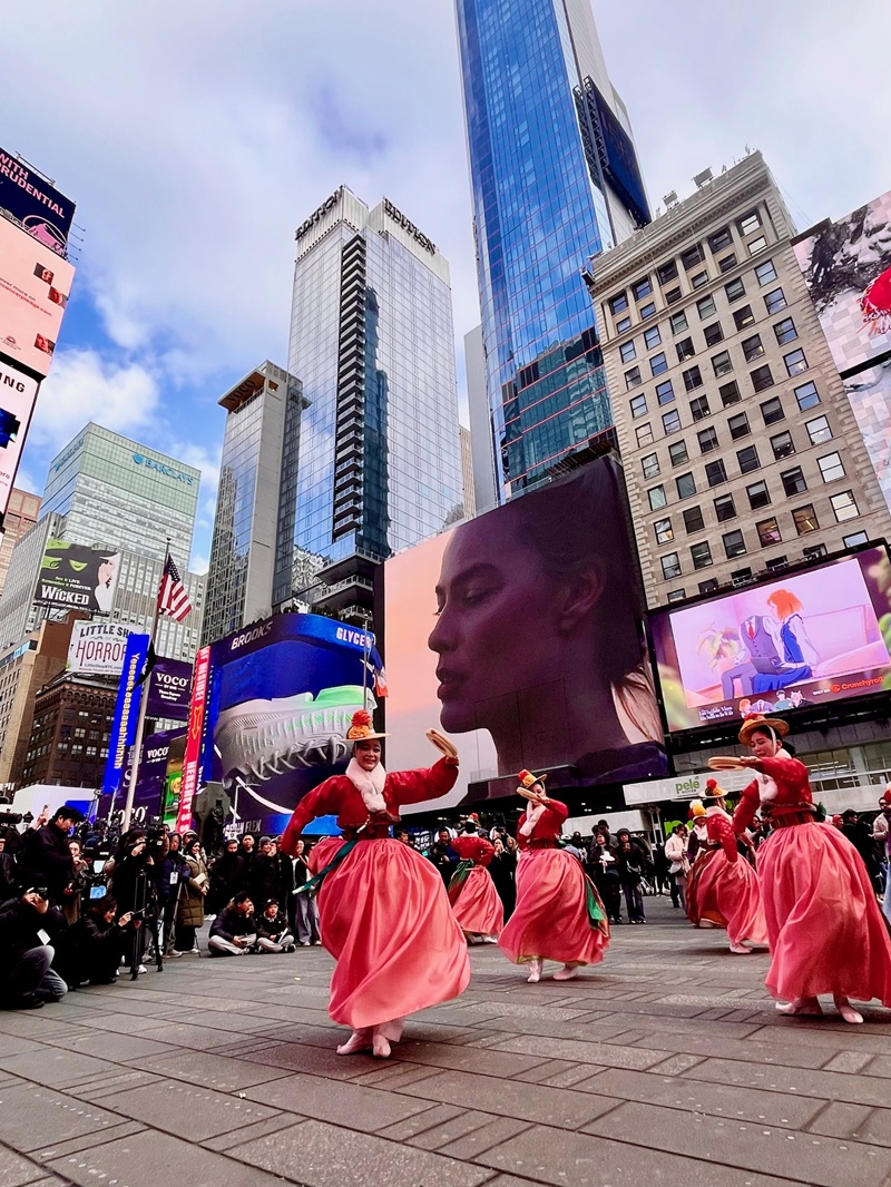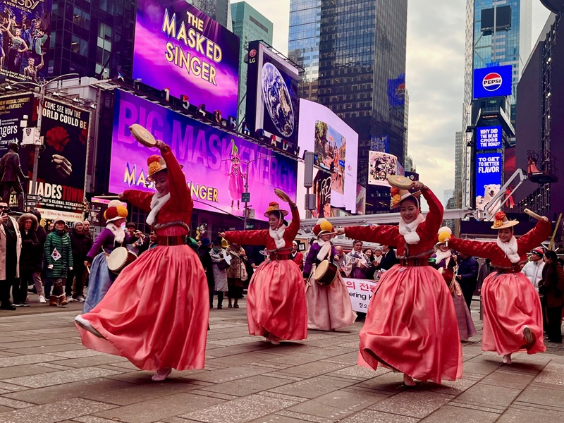 행사는 타임스스퀘어 대형 전광판을 통해 상영된 국가유산 홍보 영상으로 시작됐다. 궁중무용과 전통공예, 문화유산의 이미지는 세계 최대의 광고 무대에서 색다른 존재감을 드러냈다. 이어 2월 11일 오후 3시 타임스스퀘어 플라자에서는 ‘춤누리 한국전통무용단(KTDOC)’과 국가유산진흥원 예술단이 참여한 ‘위시스 인 모션 타임스스퀘어(Wishes in Motion Times Square)’ 공연이 약 30분간 펼쳐졌다. 모듬북과 소고춤, 진도북춤, 부채춤 등 역동적인 무대는 추운 날씨에도 불구하고 관광객과 뉴요커들의 발걸음을 붙잡았다. 공연 후 배포된 갓 모양 홍보물은 준비 수량이 모두 소진되며 현장의 높은 관심을 입증했다.