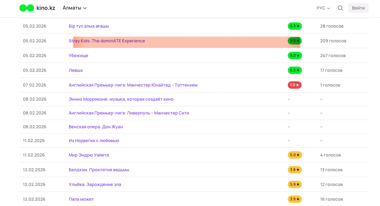 < 영화 상영 정보와 평점 - 출처: '키노(kino) 카자흐스탄' 웹사이트 >