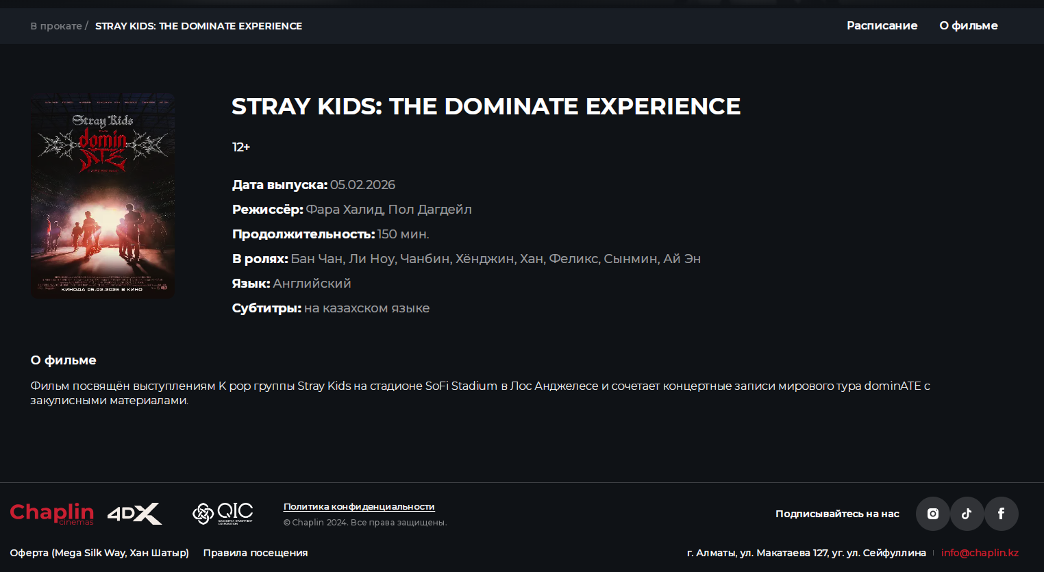 영화에는 공연 실황뿐 아니라 무대 뒤 이야기와 멤버들의 독점 인터뷰도 함께 담겼다. 스트레이 키즈는 2024년 여름부터 2025년 가을까지 이어진 ‘도미네이트’ 월드 투어를 통해 전 세계 35개 지역에서 총 56회의 콘서트를 개최했으며, 약 1억 8,500만 달러의 수익을 기록하며 해당 연도 가장 성공적인 케이팝 투어 그룹으로 빌보드 차트에 이름을 올렸다. 카자흐스탄 수도 아스타나와 주요 도시 알마티, 쉼켄트 지역 극장에서 영화가 개봉되자 현지 팬들의 발길이 이어졌다. 각 극장 사이트에서는 10점 만점 기준 평균 평점 9.5를 기록했으며, 상영 회차마다 관객들로 객석이 가득 찼다.