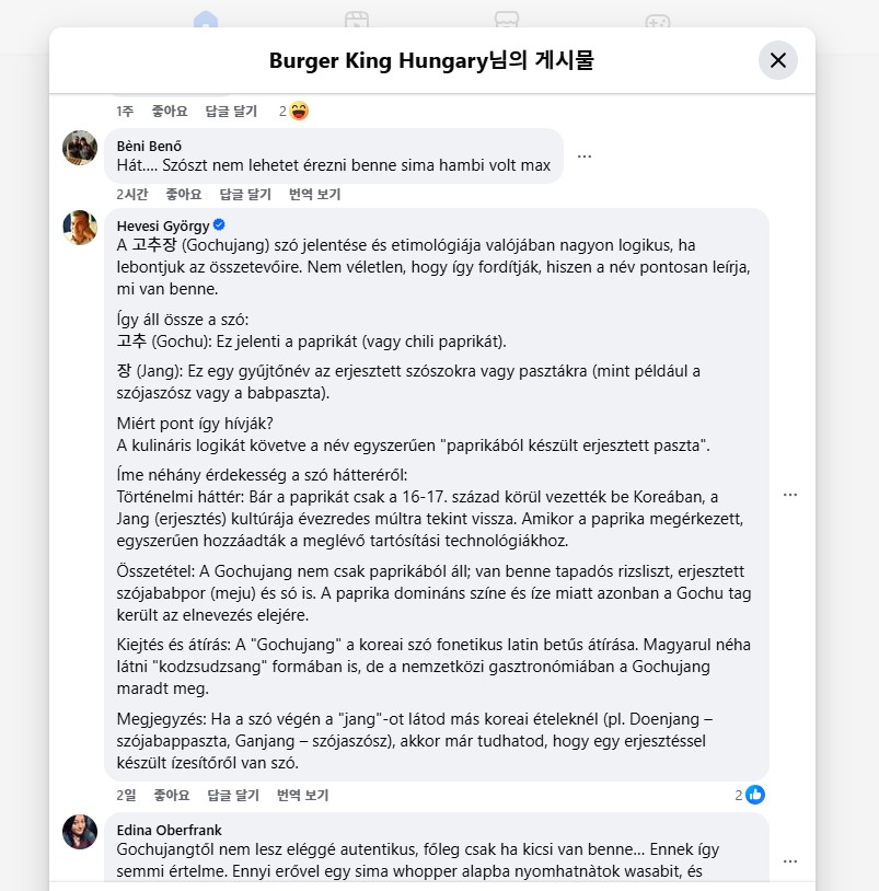 < '킹스 그레이트 고추' 버거 출시 관련 현지인 반응 및 고추장 어원 분석이 담긴 버거킹 헝가리 페이스북 댓글 - 출처: 버거팅 헝가리(@BurgerKingHU) 페이스북 >