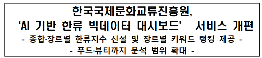 문화체육관광부(장관 최휘영, 이하 문체부)와 한국국제문화교류진흥원(원장 박창식, 이하 진흥원)은 해외 한류 콘텐츠 이용자 반응과 확산 동향을 분석하는 ‘AI 기반 한류 빅데이터 대시보드(이하 대시보드)’를 개편해 새롭게 선보인다. 이번 개편은 기존의 AI 기반 맥락 분석 기능을 고도화하고 이용자 편의성과 접근성을 개선하는 데 중점을 두었으며, 이를 통해 글로벌 한류 동향을 보다 입체적이고 체계적으로 파악할 수 있도록 했다. 주요 개편 내용은 ▲ 종합·장르별 한류지수(Hallyu Issue Index, HII) 시계열 분석 신설 ▲ K-소비재(푸드·뷰티) 추가로 6대 장르 분석 ▲ 인도네시아어·스페인어·태국어 데이터 추가 수집 ▲ 장르별 키워드 랭킹 TOP 100 확대 제공 ▲ 월간 종합 리포트 신설 등이다.