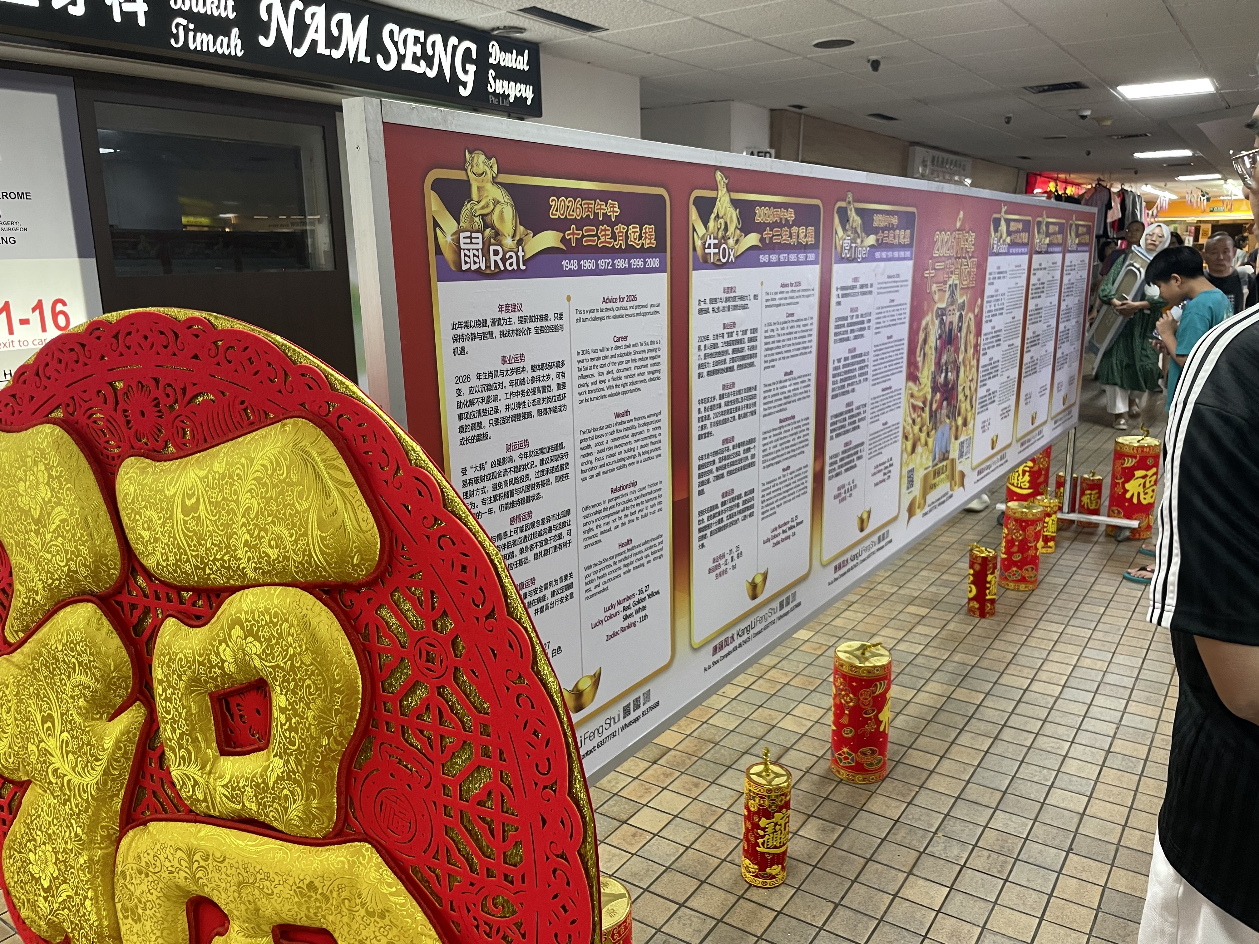 과거 싱가포르의 설날이 화교 사회 중심의 전통 명절 행사 성격이 강했다면, 최근에는 다민족 국가라는 특성을 반영해 인종과 종교를 초월한 범국가적 축제로 확장되고 있다는 평가가 나온다. 명절 분위기 역시 특정 공동체에 국한되지 않고 사회 전반으로 확산되는 양상을 보이고 있다. 대형 쇼핑몰들은 단순한 상업 공간을 넘어 설 문화를 체험할 수 있는 문화 플랫폼으로 변모했다. 방문객들은 장식과 공연을 감상하는 데 그치지 않고 다양한 체험 프로그램을 통해 새해의 복을 기원하며 명절 문화를 직접 경험하고 있다. 특히 설 기간 동안 쇼핑몰은 일종의 ‘대형 점술관’ 같은 모습으로 바뀐다. 부킷티마(Bukit Timah) 지역 쇼핑몰 중앙에는 띠별 운세를 상세히 소개한 대형 전시판이 설치돼 방문객들의 관심을 끌고 있다. 2026년 말의 해를 맞아 말띠 운세는 물론 쥐띠부터 돼지띠까지 12간지 각각의 건강운, 재물운, 직업운, 애정운을 사주풀이 형식으로 소개하며 관람객 참여를 유도한다. 이러한 전시는 전통 점술 문화를 현대적 쇼핑 공간 안으로 끌어들여 명절 체험 요소로 재해석한 사례로 평가된다.