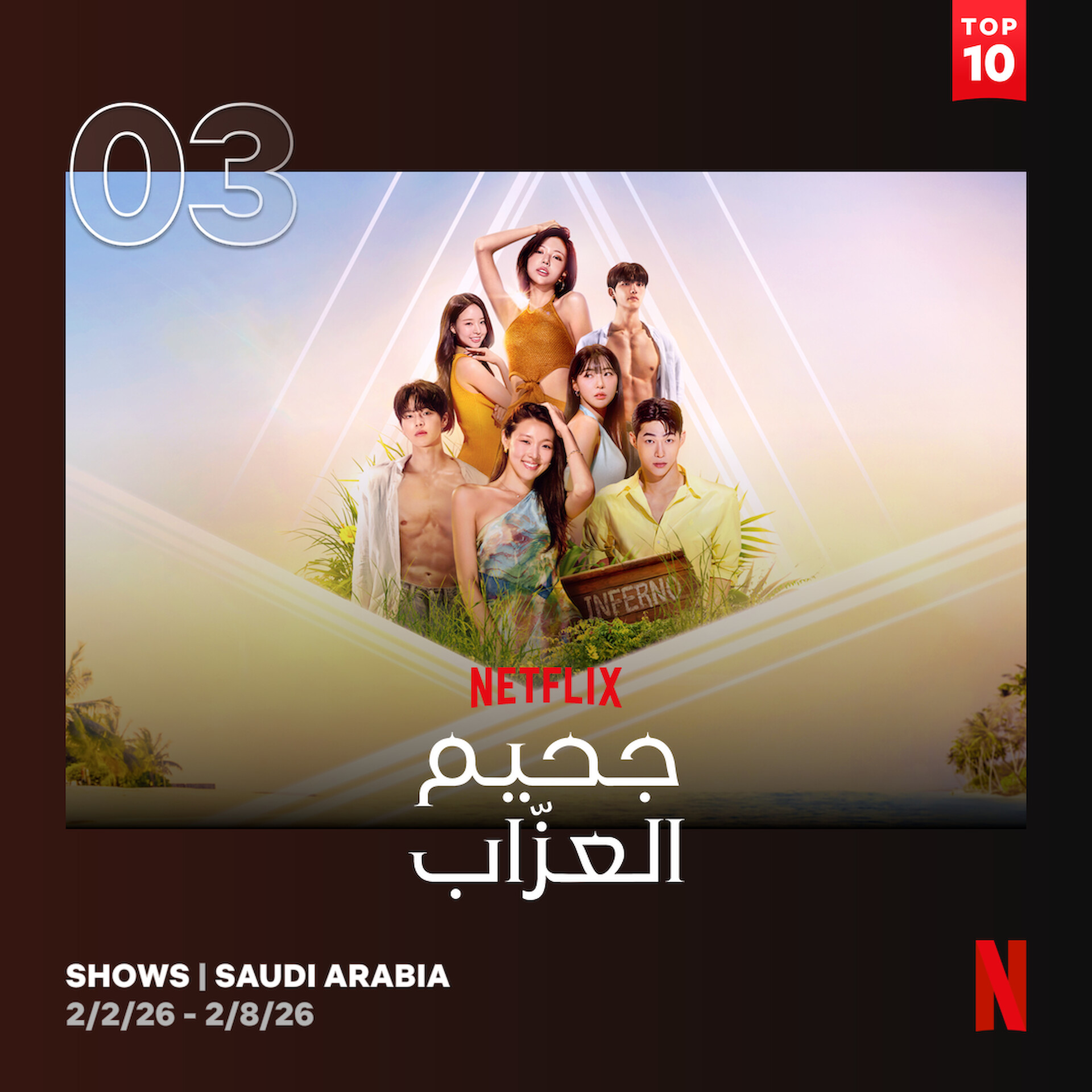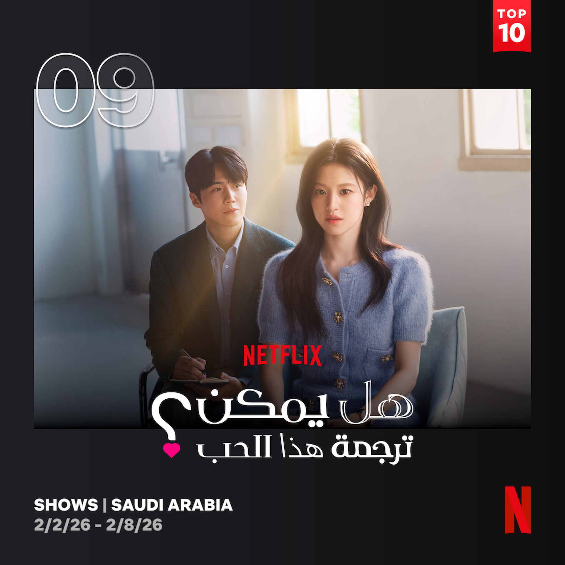 < 사우디 넷플릭스 쇼 톱10(2월 1주차) 3위 ‘솔로지옥 시즌5’, 9위 ‘이 사랑 통역 되나요?’- 출처: '넷플릭스' 홈페이지 >