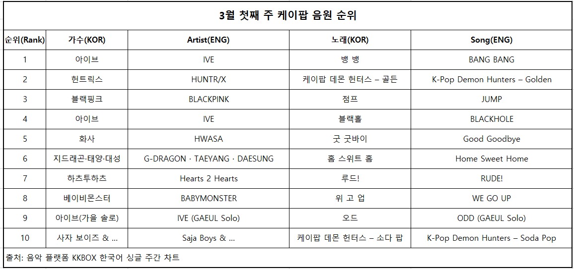 < 3월 첫째 주 케이팝 음원 순위 – 출처: 음악 플랫폼 'KKBOX' 한국어 싱글 주간 차트 >