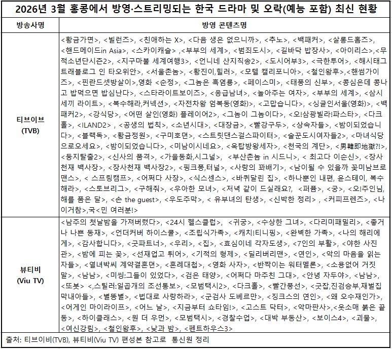 KBS 2TV 드라마 <남주의 첫날 밤을 가져버렸다>가 <24시 헬스클럽> 후속으로 방영을 시작하며 큰 인기를 끌고 있다. 이 드라마는 서양풍 로맨스 판타지 장르였던 동명의 원작 웹소설을 사극 로맨스로 재해석한 작품으로, 서현과 옥택연이 주연을 맡아 홍콩 시청자들에게 높은 관심을 받고 있다. 특히 홍콩에서 인기가 높은 사극 로맨스 장르와 아이돌 시절부터 사랑을 받아온 두 스타의 조합이 핵심 인기 요인으로 꼽히고 있다. 한편, 로맨틱 블랙코미디 <다리미 패밀리>도 주인공들의 뛰어난 연기력과 탄탄한 스토리 덕분에 홍콩 시청자들에게 두 달 이상 꾸준한 사랑을 받고 있다. 이외에도 일일 드라마 <황금가면>은 30~50대 여성 시청자층에게 인기를 끌며, 드라마 <빨강 구두>가 과거의 영광을 재현할지 주목되고 있다.