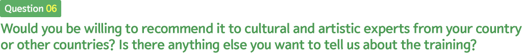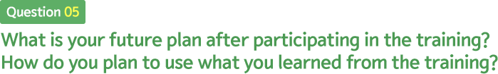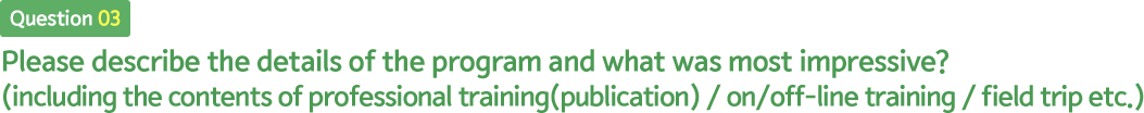 The topic that impresses me most through online training period are “Concepts and Uses for Cultural Resources” by Professor Park Shin Hee from School of Culture and Art Management at Kyunghee University and “Developing an Action Plan”. During the invitation training in Busan, two contents brought me the newest and useful knowledge are “creating book contents for children education” and “Illustrating children’s book” section. The field trip to Busan Metropolitan Library was the most impressive trip to me.