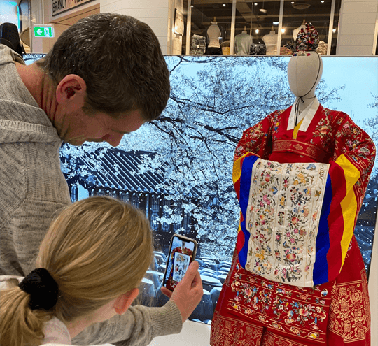 In addition to displaying hanbok worn by Korean celebrities in a number of popular period films and TV series-including The Treacherous, Sungkyunkwan Scandal, Love in the Moonlight, Mr. Sunshine, and Lovers in the Red Sky-the convergence program evoked memories and interacted with the audience through AR technology.