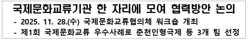 문화체육관광부(장관 최휘영, 이하 문체부)는 한국국제문화교류진흥원(원장 박창식, 이하 진흥원)과 함께 11월 26일(수) 서울 코트야드 메리어트 서울 남대문 호텔에서 ‘2025 국제문화교류 협의체’ 회의를 개최한다. 국내외 문화예술 기관, 문화재단, 주한 외국 문화원·대사관 등 44개 기관‧단체의 약 80명의 실무자가 참석해 국제문화교류 현장에서의 경험을 공유하고 향후 협력 방향을 논의할 예정이다.