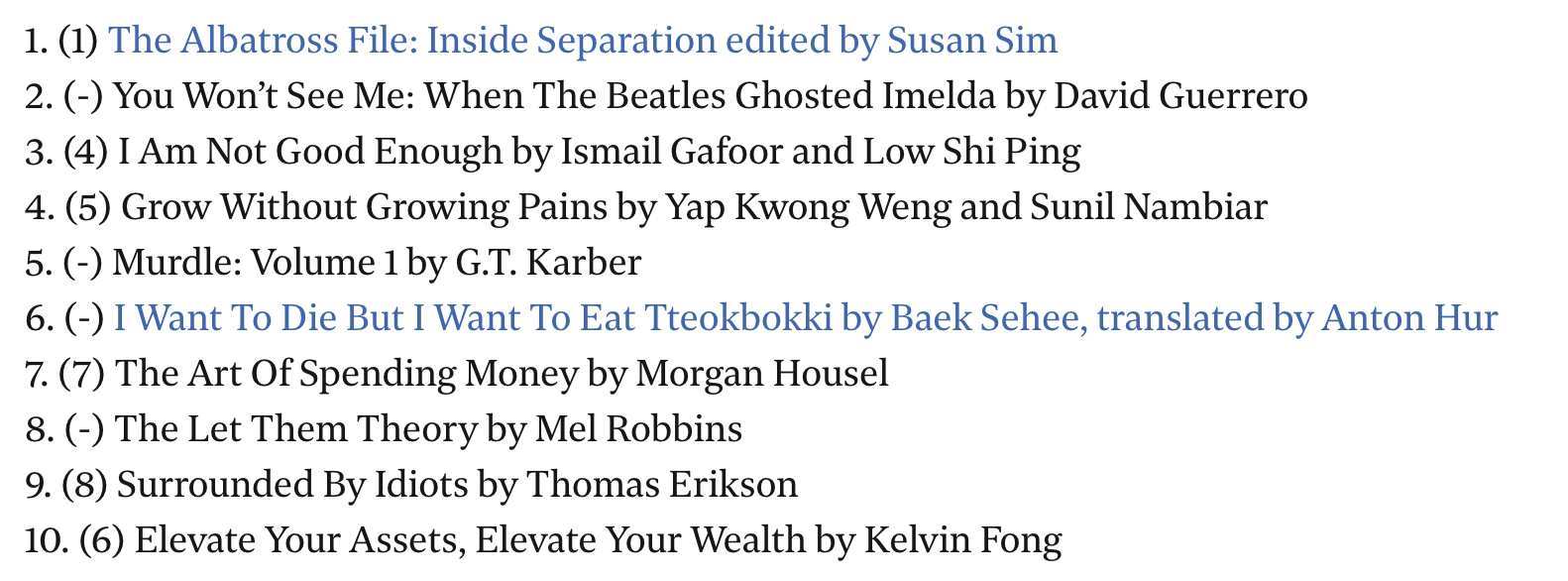 < 12월 27일 논픽션 부분 주간 베스트셀러 차트 - 출처: '더 스트레이츠 타임스(The Straits Times)' 주간 차트 뉴스 기사 >