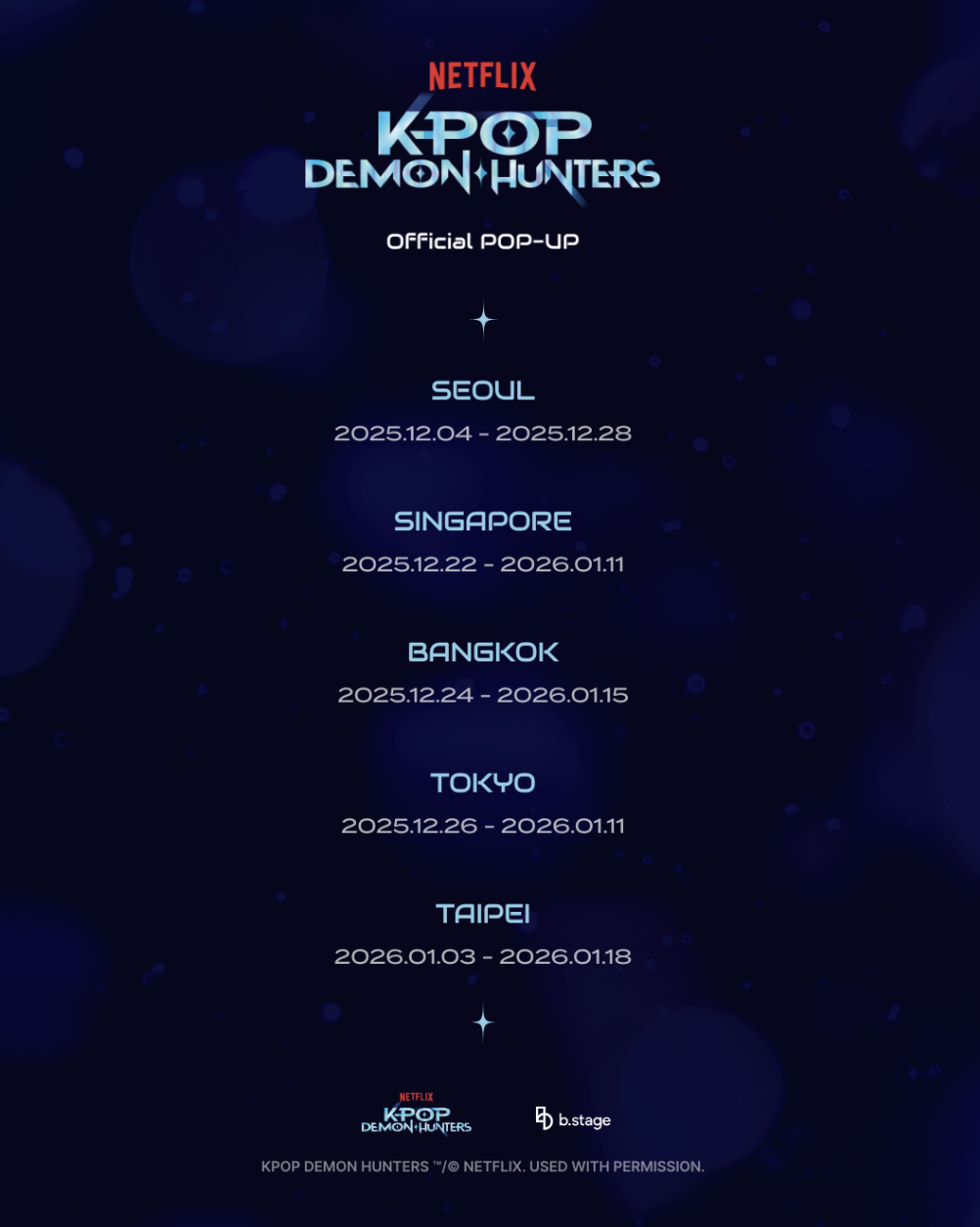 < 각국의 ‘케이팝 데몬 헌터스’ 팝업 매장 운영 일정을 기재한 포스터 - 출처: ‘케이팝 데몬 헌터스’ 공식 팬 홈페이지 >