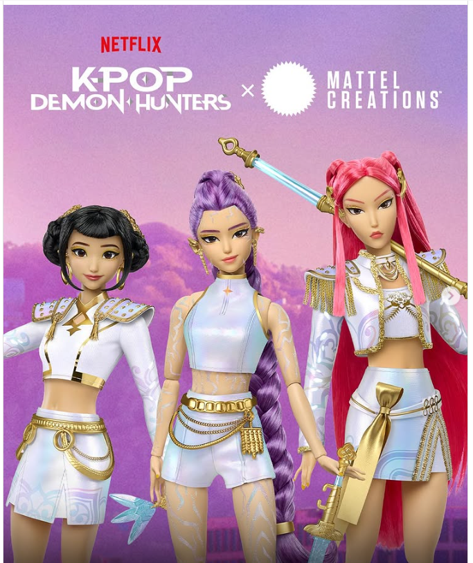 이미 넷플릭스(Netflix)를 통해 멕시코는 물론 전 세계적으로 신드롬적인 흥행을 기록한 <케이팝 데몬 헌터스>는 이번 연말 글로벌 완구 회사 마텔(Mattel)과 손을 잡고 주인공 3인방의 특별 컬렉션을 출시하며 화제의 중심에 섰다. 마텔 크리에이션(Mattel Creations)이 공개한 첫 이미지는 영화 속 마지막 공연 장면을 완벽하게 재현했다. 리더 루미(Rumi), 래퍼 조이(Joey), 메인 댄서 미라(Mira)는 금색 장식과 라인스톤이 조화된 무지갯빛 의상을 입고 있다. 이는 인형이란 상품의 품질을 뛰어넘은, 하나의 예술 작품과 같이 정교함을 보여준다. 특히 루미의 '생검', 조이의 '신칼', 미라의 '월도' 등 각 캐릭터의 상징적인 한국 전통 무기 액세서리가 포함되었다는 점은 멕시코 팬들에게 한국 문화의 독특한 매력을 전달하는 결정적인 요소가 되었다. ≪반구아르디아(Vanguardia)≫는 이 소장용 인형 세트가 예약 판매 직후 순식간에 매진되었음을 보도하며 멕시코 내 케이팝 캐릭터의 위력을 실감케 했다.