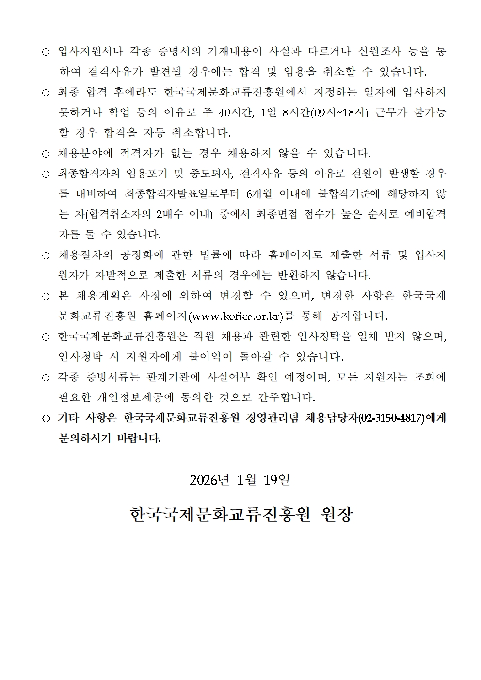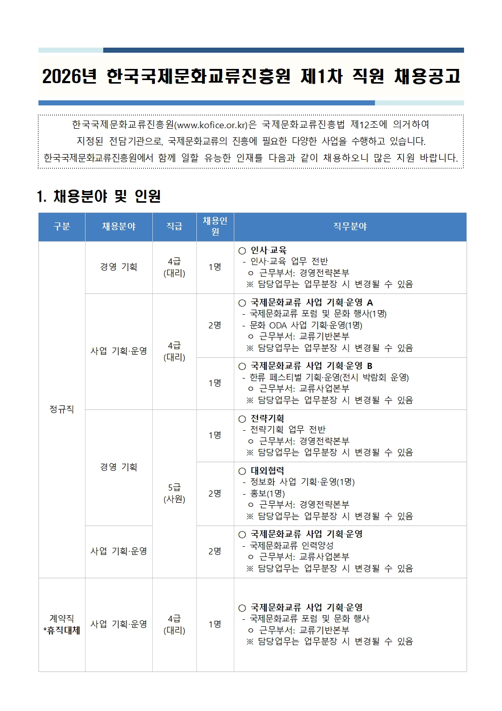 공지사항2026년 한국국제문화교류진흥원 제1차 직원 채용공고