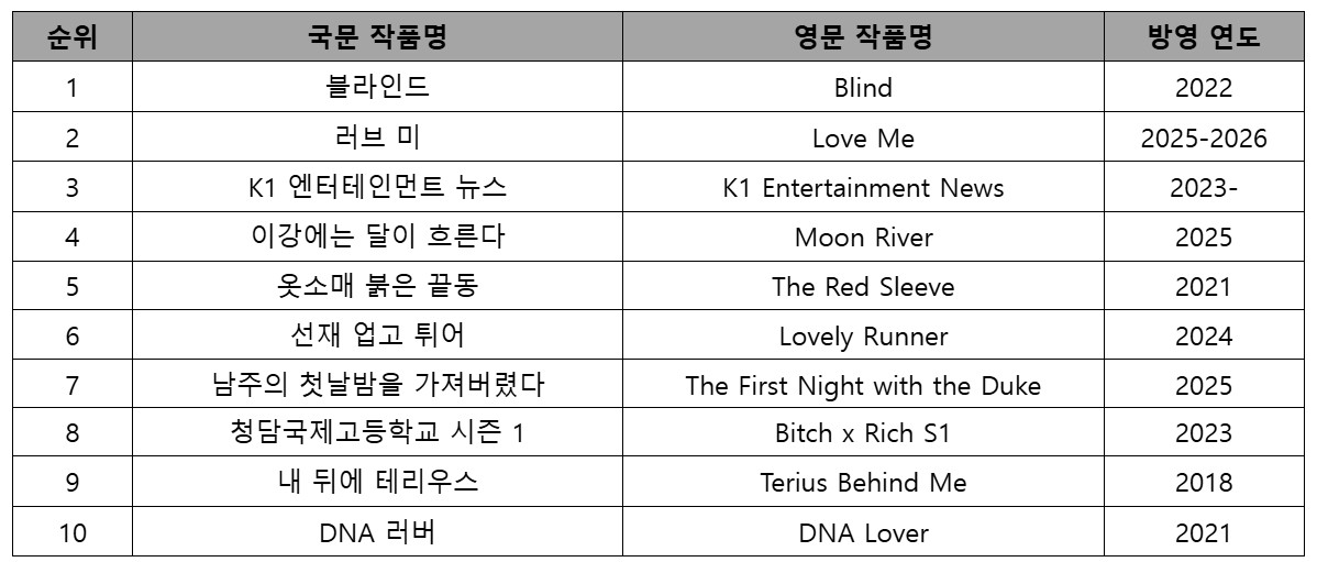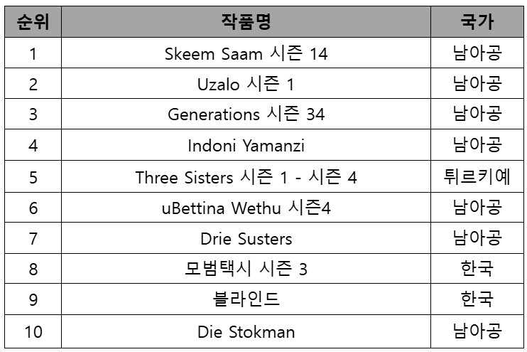 한편 뷰(Viu)가 별도로 공개한 ‘남아공 실시간 인기 한국 드라마’ 차트는 현지 한국 드라마 팬덤의 폭과 취향을 보여준다. 1위는 미스터리 스릴러 〈블라인드〉로, 범죄와 사회 문제를 다루는 진지한 장르물이 현지 시청자들에게 꾸준한 사랑을 받고 있음을 확인할 수 있다. 이어 로맨틱 코미디 〈러브 미〉, 오락 정보 프로그램 〈K1 엔터테인먼트 뉴스〉, 대만 로맨스 리메이크 작품 〈이강에는 달이 흐른다〉가 순위에 올랐다. 또한 조선 시대 궁중 로맨스를 그린 〈옷소매 붉은 끝동〉, 타임슬립 로맨스 〈선재 업고 튀어〉, 소설 원작 판타지 〈남주의 첫날밤을 가져버렸다〉, 학원 서스펜스 〈청담국제고등학교 시즌 1〉, 첩보 액션 〈내 뒤에 테리우스〉, 유전자 연구를 소재로 한 로맨틱 코미디 등이 뒤를 이었다.이 같은 순위는 남아프리카공화국 시청자들이 로맨스, 판타지, 스릴러 등 다양한 장르의 한국 드라마를 폭넓게 즐기고 있으며, 방송 연도나 기존 흥행 여부와 관계없이 콘텐츠를 적극적으로 소비하고 있음을 보여준다.