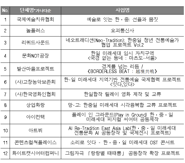 <2025-2026 한중일 문화교류의 해> 2026 한중일 미래세대 문화예술교류 지원사업 공모에 지원해주신 모든 분들께 감사드리며,