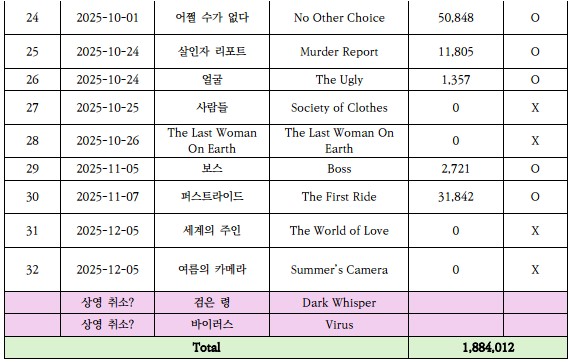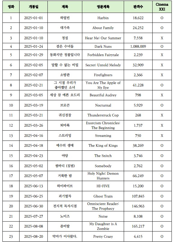 이 가운데 관객 수 ‘0명’을 기록한 네 편은 영화제 출품작으로 추정된다. 이를 제외하면 상업 수입영화로 정식 개봉한 작품은 총 28편으로 볼 수 있다. 또한 시네마 XXI에서 실제로 상영되었는지를 확인할 수 있도록 별도의 표시 컬럼을 추가했다. 표 맨 아래 보라색으로 표시된 두 작품은 시네마 XXI이 개봉 예정작으로 등록했으나 결국 스크린에 걸리지 않은 사례다. 향후 뒤늦게 상영될지, 아니면 그대로 상영이 무산될지는 아직 불확실하다.