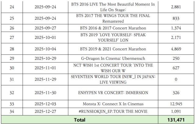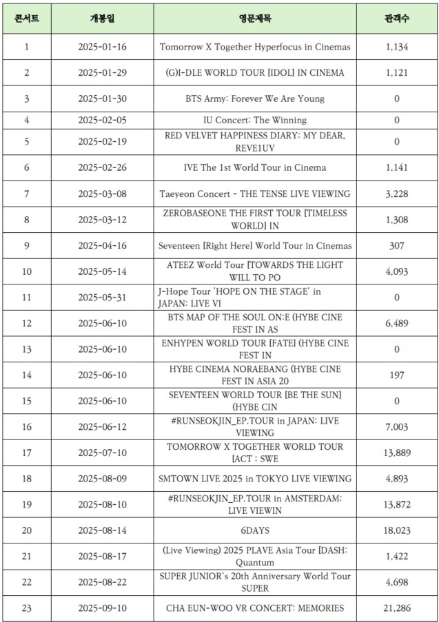 총 34편의 콘서트 영화 가운데 6편은 관객 집계가 ‘0명’으로 나타났지만 상영 횟수는 기록되어 있어 실제 상영이 이루어진 것으로 보인다. 다만 실제로 관객이 없었던 것인지, 별도의 티켓 결제 방식이 적용된 것인지, 혹은 단순 집계 누락인지에 대해서는 확인이 필요하다.