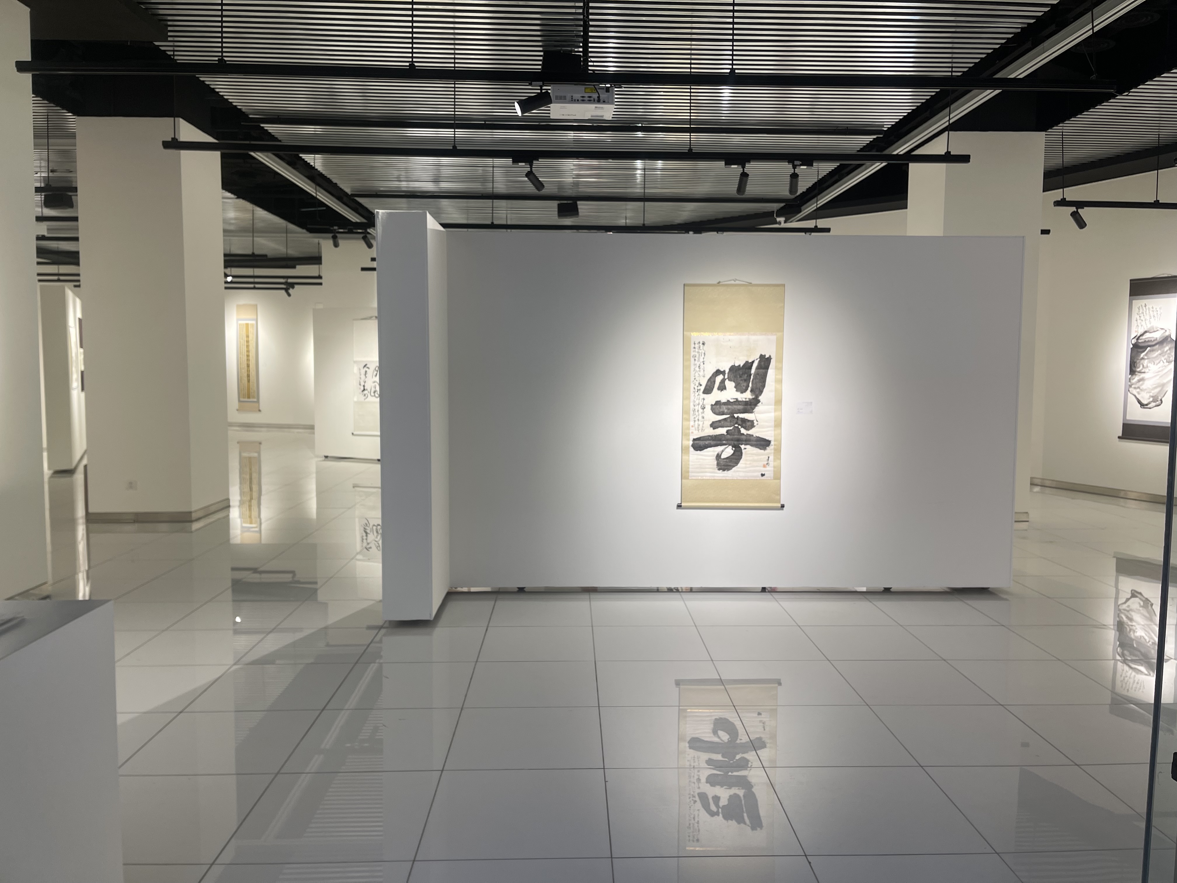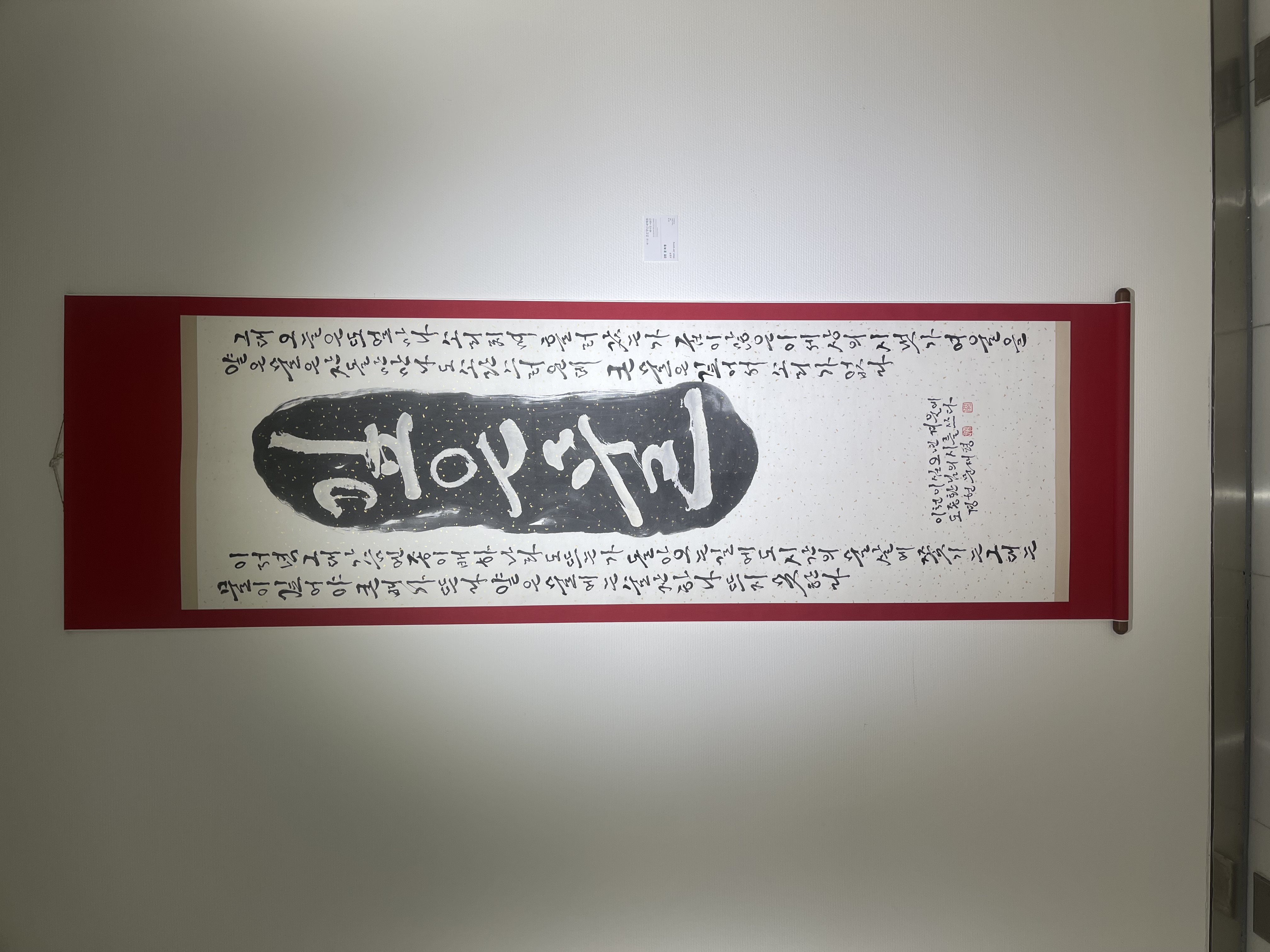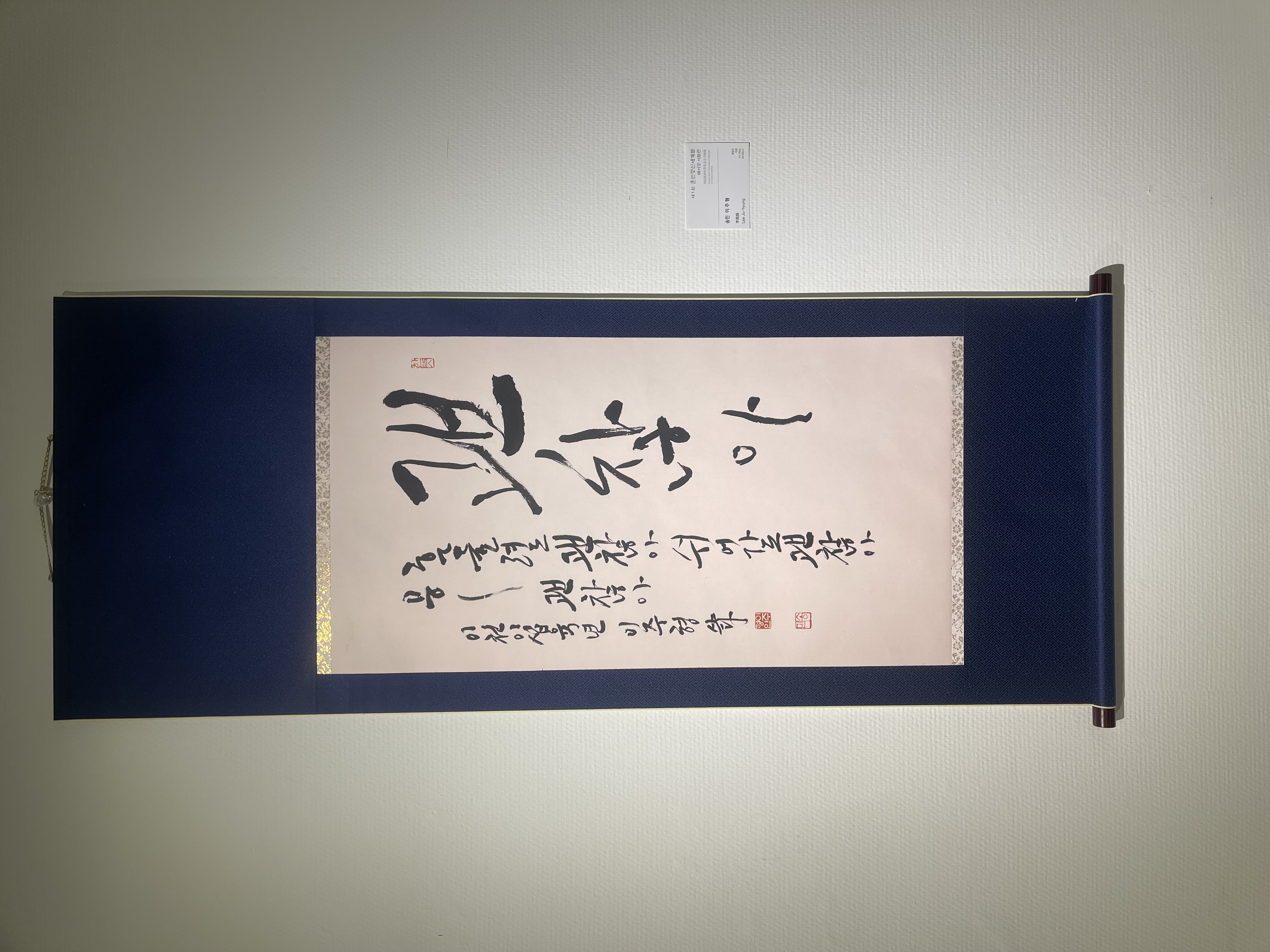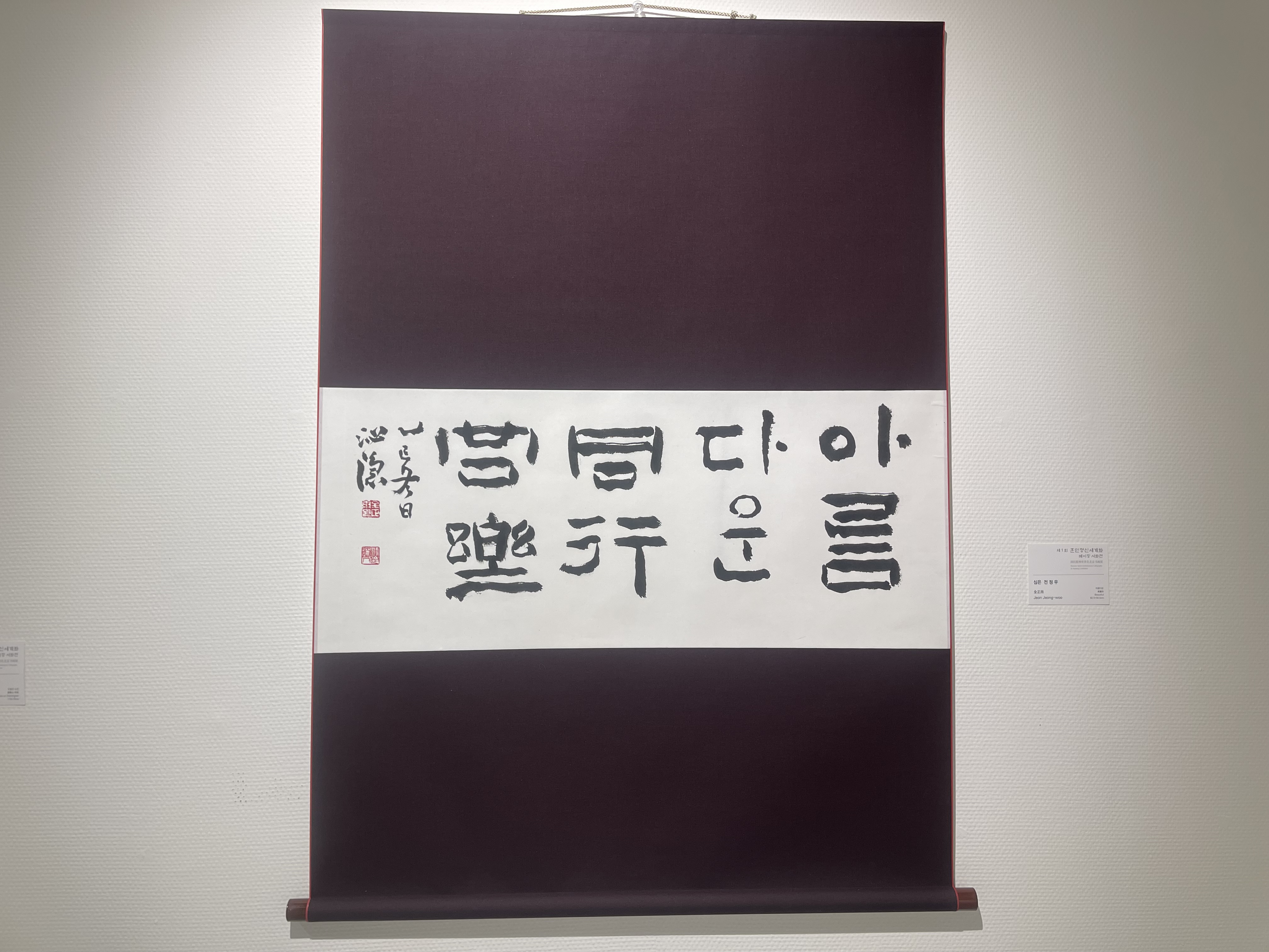 전시장에 들어서기 전 로비에서 가장 먼저 눈에 들어온 것은 전시 안내 화면이었다. ‘제1회 훈민정신세계화 베이징 전시’라는 제목과 함께 전시 일정, 장소, 관람시간이 정리된 화면은 이번 전시가 단순한 행사를 넘어 하나의 문화적 선언처럼 준비되었음을 보여주었다. 전시장으로 발걸음을 옮기자, 넓고 정갈한 공간 속에 걸린 족자 작품들이 먼저 시선을 사로잡았다. 흰 벽과 반듯한 가벽, 조명을 받은 작품들은 군더더기 없는 배치 속에서 한글의 획과 여백을 더욱 또렷하게 드러냈다. 베이징이라는 도시의 빠른 호흡과 달리, 전시장 안의 시간은 관람객으로 하여금 한 글자 한 글자를 천천히 읽고 바라보게 만드는 고요하고 집중된 분위기 속에서 흘렀다.
