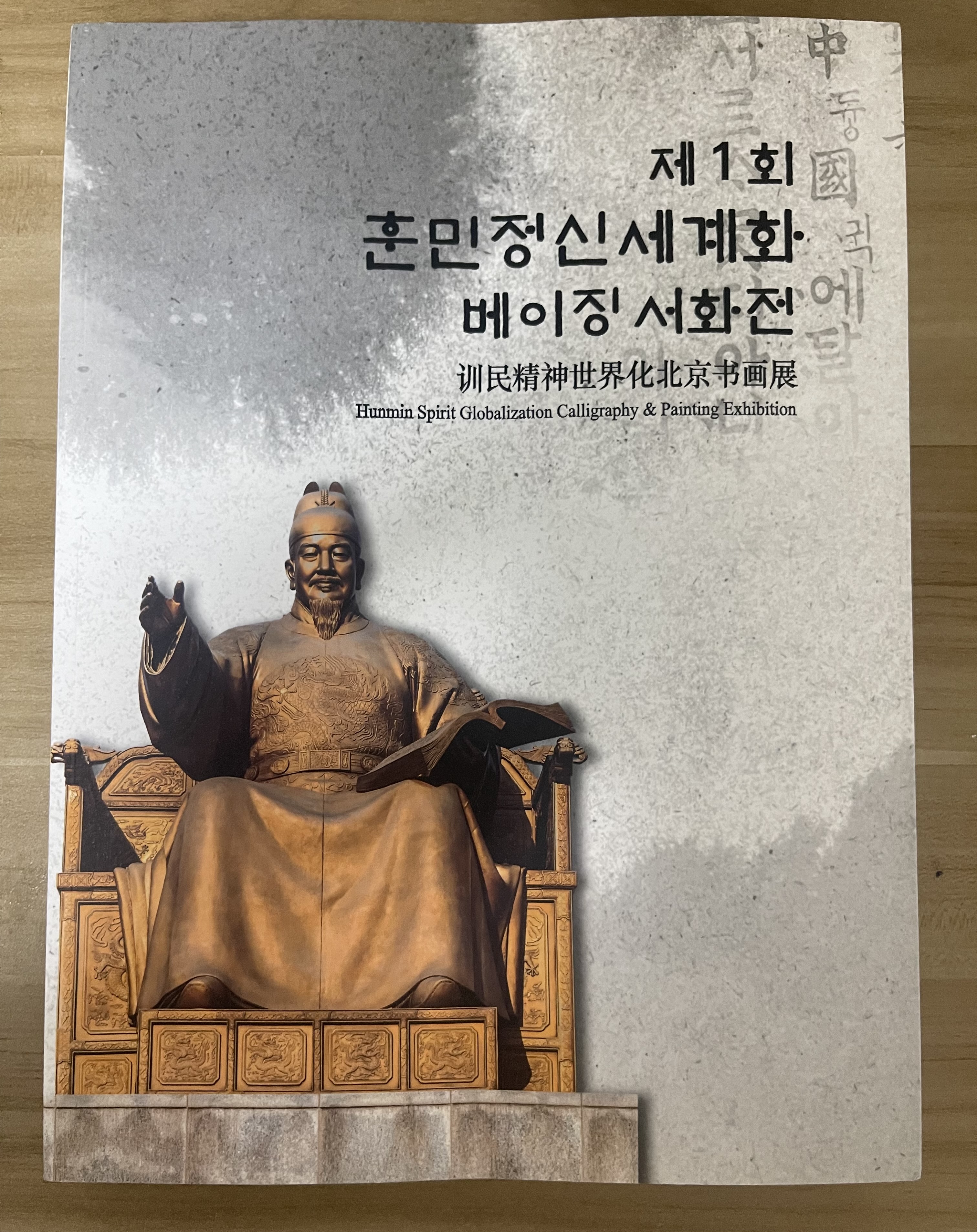 < 세종대왕 동상과 함께 한·중·영문 전시명이 실린 ‘제1회 훈민정신세계화 베이징 서화전’ 도록 표지 - 출처: 통신원 촬영 >
