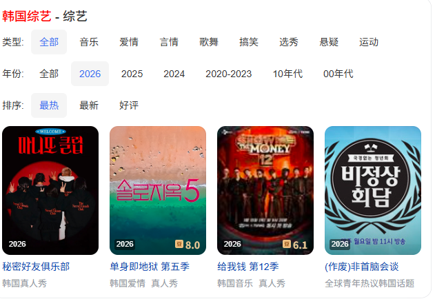 바이두에서 '한국 예능(韩国综艺)'을 검색하면 나타나는 2026년 인기 순위에서는 <秘密好友俱乐部(마니또 클럽)>가 최신 리얼 버라이어티 신작으로 최다 노출 상위에 올라 있다. 넷플릭스 연애 리얼리티 <单身即地狱 第五季(솔로지옥 시즌 5)>는 더우반 8.0점으로 예능 중 최고 평점을 기록하며 화제성과 호평을 동시에 잡았다. '솔로지옥' 시리즈는 이미 중국 팬층을 탄탄히 구축한 프로그램인 만큼, 시즌 5 역시 출연진의 케미스트리와 긴장감 있는 전개로 꾸준한 관심을 받고 있다. <给我钱 第12季(쇼미더머니 12)>는 음악 서바이벌프로그램으로 6.1점을 기록하며 화제를 유지했다.