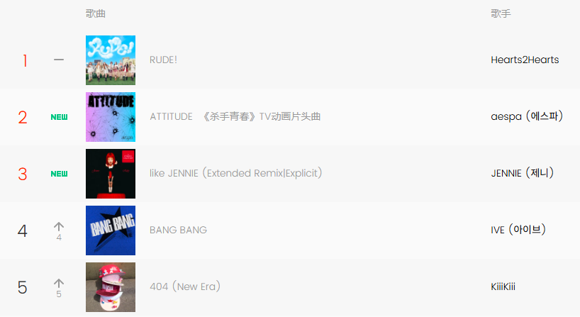 제니의 는 3위로 새롭게 진입하며 솔로 아티스트로서의 존재감을 드러냈다. 아이브의 은 전주 대비 4계단 상승해 4위를 기록했으며, KiiiKiii의 <404(New Era)> 역시 5계단 오르며 5위에 이름을 올렸다.