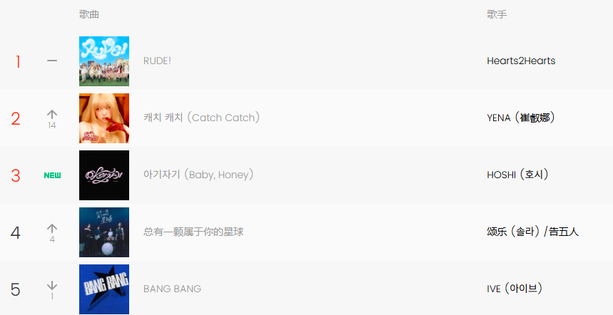 세븐틴 멤버 호시의 솔로곡 <아기자기(Baby, Honey)>는 발매 직후 3위로 진입하며 안정적인 초기 성과를 보였다. 마마무 솔라와 중국 밴드 吉五人의 한·중 협업곡 <总有一颗属于你的星球(Your Own Star)> 역시 4위에 오르며 주목을 받았다. 이는 한·중 아티스트 협업 콘텐츠가 중국 차트에서 일정 수준의 반응을 확보하고 있음을 보여주는 사례로 볼 수 있다.
