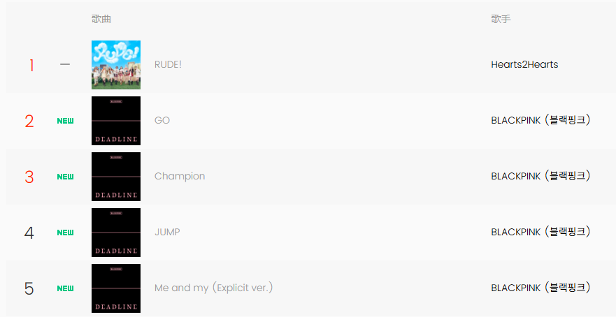 3월 첫째 주에는 블랙핑크의 정규 앨범 [DEADLINE] 발매 영향으로 차트 상위권에 뚜렷한 변화가 나타났다. 타이틀곡<GO>를 비롯해<Champion>,<JUMP>,<Me and My (Explicit Ver.)>가 나란히 2~5위를 기록하며 블랙핑크가 상위권을 차지하는 양상을 보였다. 이는 완전체 컴백에 대한 중국 팬층의 높은 관심이 스트리밍 지표에 반영된 결과로 해석된다. 한편, 1위는 Hearts2Hearts의 가 유지했다.