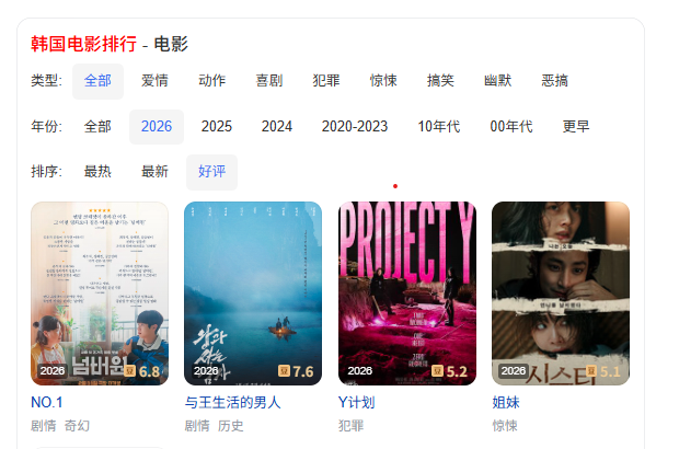 바이두에서 '한국 영화(韩国电影)'를 검색하면 나타나는 2026년 호평 순위에서는 <与王生活的男人(왕과 사는 남자)>가 더우반 7.6점으로 가장 높은 평가를 받았다. 뒤를 이어 넘버원)>이 6.8점, 이 5.2점, <Y计划 (프로젝트 Y)>이 5.2점을 각각 기록했다. 전반적으로 이번 달 한국 영화의 중국 내 반응은 7점대 이상의 고평점 작품이 드물었다. 완전한 공식 유통 채널 부재, 극장 개봉 제한이라는 구조적 한계 속에서도 바이두 검색을 통해 한국 영화에 대한 수요 자체는 꾸준히 존재한다는 점이 확인된다.