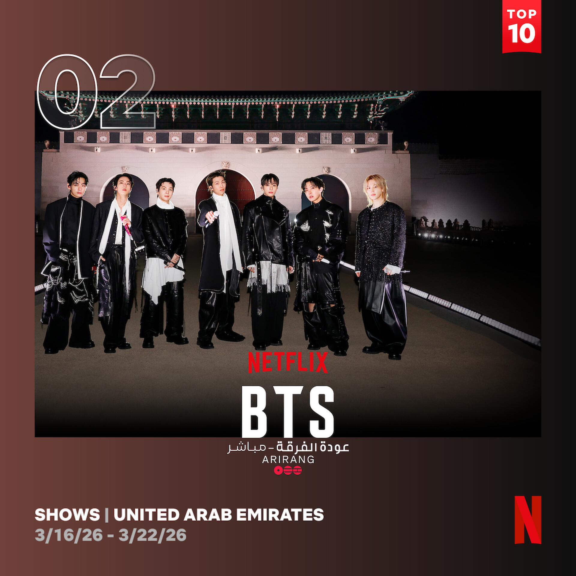 이번 순위의 최대 화제는 단연 BTS의 컴백이다. 2위에 오른 은 지난 3월 21일 서울 광화문 광장에서 열린 BTS의 4년 만의 완전체 컴백 공연을 넷플릭스가 실시간 생중계한 콘텐츠다. 케이팝 공연이 넷플릭스에서 라이브로 중계된 것은 이번이 처음이며, 공연은 5집 정규앨범 <아리랑(ARIRANG)>의 수록곡과 함께 〈마이크 드롭(Mic Drop)〉, 〈버터(Butter)〉, 〈다이너마이트(Dynamite)〉 등 글로벌 히트곡이 선보여졌다. 약 3년 9개월간의 군 복무 공백을 딛고 돌아온 BTS의 컴백 공연이 UAE 넷플릭스 2위에 오른 것은 중동 지역에서 BTS의 팬층이 여전히 두텁다는 것을 증명한다.
